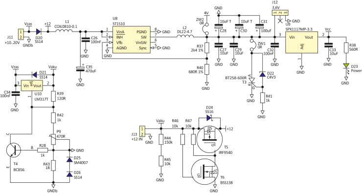 Tyrystor T3 i dioda D22 zabezpieczają elektronikę w wypadku awarii zasilacza. Domofon można wyposażyć w zasilanie awaryjne - należy doprowadzić je do J13. W najprostszej wersji nie są montowane T5 i T6, tylko dioda D24. Jeśli jest wymagane, aby na zasilaniu awaryjnym domofon działał jak najdłużej, można zamontować T5 i T6. Wtedy to napięcie akumulatora otwiera tranzystor T5 za pośrednictwem T6. Spadek napięcia na T5 jest praktycznie zerowy.