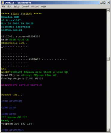 Do uruchomienia domofonu jest wymagana aktywna karta SIM. Jeśli karta musi być zabezpieczona kodem PIN, trzeba go ustawić na „5555”. Po włączeniu zasilania zostanie przeprowadzona diagnostyka. W czasie uruchamiania należy połączyć domofon z komputerem. Najlepiej sprawuje się program TeraTerm, ponieważ po utracie połączenia USB podejmuje próbę jego odzyskania. Po uruchomieniu programu w terminalu ujrzymy obraz jak na rysunku 4.