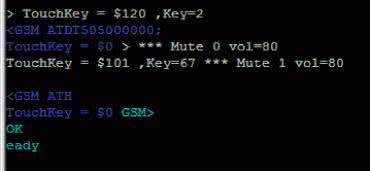 Podczas pracy domofonu za pomocą interfejsu USB są wysyłane informacje związane z komunikacją z modemem, czyli o: wybieranym numerze, połączeniu przychodzącym, synchronizacja RTC oraz stanie domofonu, jak ID karty RFID lub otwarciu furtki. Komunikacja z modemem przebiega nawet podczas bezczynności, jest sprawdzany poziom sygnału, wybrany operator, synchronizowany czas z RTC. Do terminalu są przesyłane również informacje o stanie RFID, kontrolerze ekranu dotykowego czy panelu pojemnościowego. Na rysunku 6 pokazano komunikat o zadziałaniu przycisku na panelu pojemnościowym. Jest to przycisk „2” (rawKey 120, kod klawisza 2), który powoduje wybranie numeru „505000000”. Dalej widać zwolnienie przycisku, włączenie wyciszania wzmacniacza m.cz. Po chwili naciśnięto przycisk „C” (rawKey 101, kod klawisza 67 - znak „C”) w rezultacie czego wydana została komenda „ATH” przerywająca połączenie.