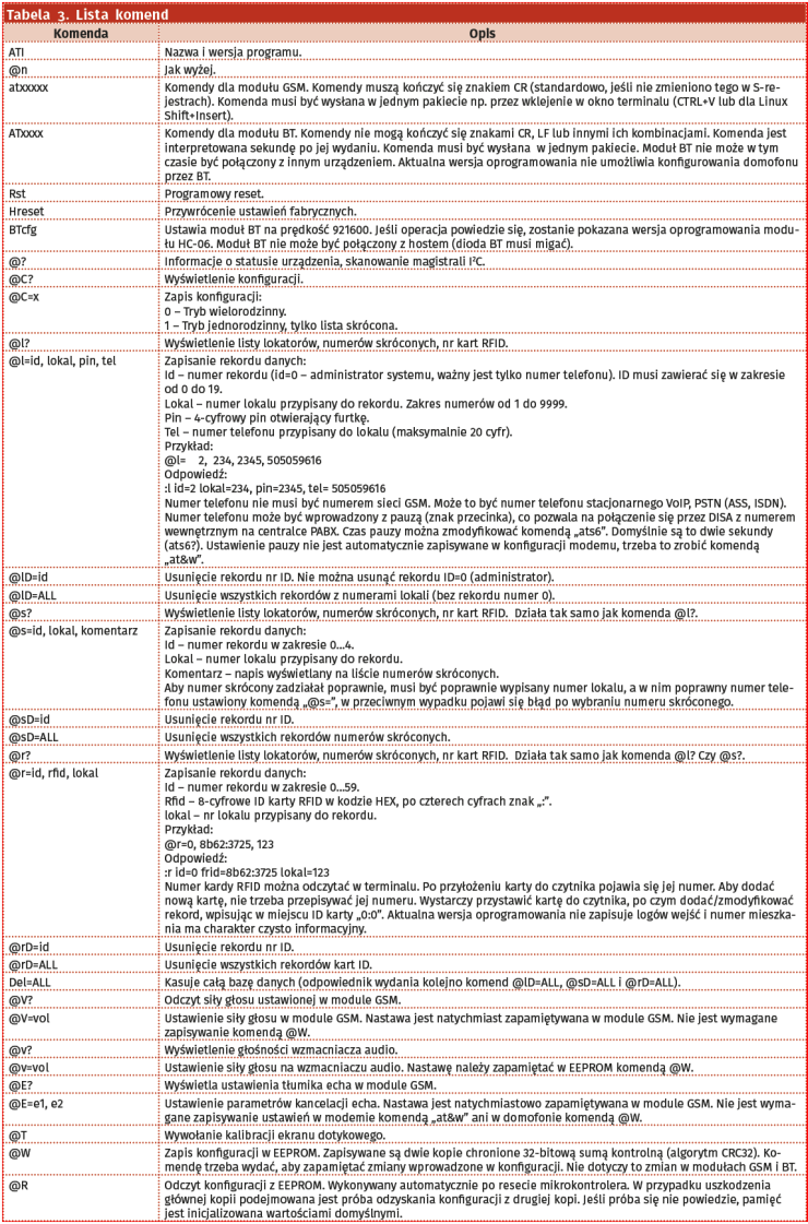 Polecenia realizowane przez oprogramowanie domofonu wymieniono w tabeli 3. Zmiany w konfiguracji są zapisywane w EEPROM po wydaniu komendy @W. Jeśli konfiguracja nie zostanie zapamiętana, to po restarcie, przywrócone zostaną ustawienia z EEPROM. Dzięki temu, jeśli zostanie popełniony błąd, poprzednią konfigurację można przywołać przez restart lub prościej - komendami „rst” lub odczyt EEPROM „@R”.