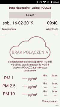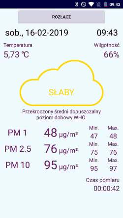 Po pomyślnym zestawieniu połączenia sensor BBair rozpoczyna wykonywanie pomiarów, błyskając diodą. Chwilę później przesyła pierwsze stabilne wyniki wprost na ekran smartfonu jak na rysunku 8. Poza lakonicznym wyświetlaniem koncentracji pyłów poszczególnych frakcji, temperatury oraz wilgotności względnej, aplikacja określa również aktualny stan powietrza, wykorzystując polskie normy oraz zalecenia Światowej Organizacji Zdrowia (WHO). Wszystkie możliwe wskazania pokazuje tabelka z rysunku 9.