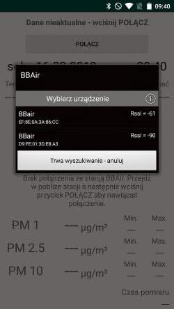 Zobaczmy teraz, jak przedstawiony model Bluetooth LE działa w realnym świecie. Po zainstalowaniu dwóch baterii lub akumulatorów AAA w nasz sensor jakości powietrza zostaje tchnięte życie. Zielona dioda LED mrugnie kilkukrotnie, sygnalizując poprawny start czujnika. Po tej spektakularnej akcji sensor nie daje widocznego znaku działania, ale jako urządzenie peripheral wysyła krótkie komunikaty rozgłoszeniowe, informując o swojej obecności, gotowości do zestawienia połączenia i udostępnienia danych. Potrzebujemy teraz urządzenia central, które skorzysta z danych dostarczanych przez nasz sensor jakości powietrza. W tej roli wystąpi smartfon z systemem Android w wersji nie niższej niż 4.4.2 - to chyba w zasadzie każdy obecnie dostępny na rynku. Ponieważ, jak wspomnieliśmy wcześniej, technologia Low Energy nie jest kompatybilna wstecz, musi on mieć wersję Bluetooth nie niższą niż 4.0. Jeśli obydwa warunki są spełnione, to spod adresu www.PokochajCzystePowietrze.pl możemy pobrać aplikację BBair. Po zainstalowaniu i uruchomieniu zostanie pokazany ekran jak na rysunku 6. Aby smartfon, jako urządzenie central, rozpoczął skanowanie w poszukiwaniu partnerów peripheral, musimy nacisnąć przycisk POŁĄCZ. Po chwili w nowym okienku zaczną pojawiać się kolejne wiersze opisujące znalezione urządzenia Bluetooth SMART.