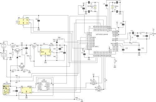 Całością będzie zarządzał kontroler umożliwiający realizację komunikacji Bluetooth Low Energy z rodziny nRF51 oznaczony na schemacie U1. Standardowo został on otoczony komponentami niezbędnymi do prawidłowego działania: główny rezonator kwarcowy X1 o częstotliwości 16 MHz i zegarkowy X2. Komponenty zgrupowane wokół L2, L3 i L4 stanowią układ dopasowania wyjścia RF do anteny.