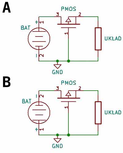 Ciekawym wyzwaniem okazało się zorganizowanie systemu zasilania. Nasz sensor smogu będzie działał z zasilaniem bateryjnym, ale priorytet powinno mieć zasilanie kablowe z portu micro-USB. Baterie/akumulatory muszą być dwa, aby uzyskać dostatecznie wysokie napięcie zasilania. Powinny też dać się łatwo wymieniać na nowe, aby po rozładowaniu pakietu w terenie nasz sensor smogu był gotów do kolejnych pomiarów w kilka chwil. Z powyższego wynika konieczność zastosowania zabezpieczenia przed odwrotnym, omyłkowym zainstalowaniem baterii. Zrealizować to można prosto za pomocą tranzystora PMOS, w sposób pokazany na schemacie z rysunku 3. Gdy polaryzacja baterii BAT jest prawidłowa, jak na schemacie 3A, tranzystor przewodzi przez wewnętrzną diodę i zabezpieczany układ jest prawidłowo zasilany. W przypadku odwrócenia biegunów baterii (schemat 3B) tranzystor jest zablokowany przez dodatni potencjał na jego bramce, co chroni urządzenie przed przepływem prądu w niepożądanym kierunku - prosta sprawa.