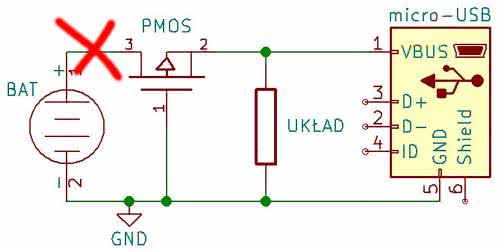 Kolejnym jednak aspektem jest zasilanie z portu micro-USB: nie możemy wymagać, aby użytkownik przed każdym podłączeniem kabla wyjmował baterie z sensora. Jednocześnie poprzez złącze micro-USB nie może być realizowane ładowanie, ponieważ nigdy nie mamy pewności, czy w urządzeniu zainstalowane są akurat akumulatory. Być może użytkownik zdecydował się na użycie baterii, które nie tolerują ładowania. Zatem możliwość przepływu prądu w tym kierunku powinna zostać zablokowana. Niestety sam tranzystor PMOS, którego już użyliśmy, nie zrealizuje tego zadania, ponieważ po podłączeniu kablowego zasilania USB będzie spolaryzowany do przewodzenia prądu w kierunku baterii. Pokazuje to uproszczony schemat z rysunku 4. Wstawienie diody blokującej zamiast tranzystora PMOS nie wchodzi jednak w grę ze względu na występujący na niej zbyt duży spadek napięcia.