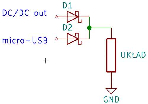 Następne wyzwanie w projektowanym układzie przełącznika zasilania stanowi dostarczanie 5-woltowego napięcia dla samego sensora PMS. Wymagania są takie, że gdy układ korzysta z baterii/akumulatorów, napięcie to musi być generowane przez konwerter DC-DC pracujący w konfiguracji boost. Jednak po wsunięciu wtyczki microUSB, to właśnie z tego portu chcielibyśmy czerpać energię. Najprostszym rozwiązaniem byłoby zastosowanie dwóch diod ułożonych jak na rysunku 5, ale niestety jest to niemożliwe. Napięcie w standardzie USB może wahać się w przedziale 4,75…5,25 V, a minimalne napięcie pracy sensora PMS to 4,5 V. Nie ma tu już niestety miejsca na spadek napięcia na diodzie. Cała ta układanka tworzy nam nietrywialną sytuację, wyglądającą jak węzeł gordyjski. Niespodziewanie jednak wszystkie problemy rozwiązało kilka tranzystorów i przełącznik zasilania AP2171 (na schemacie U52).