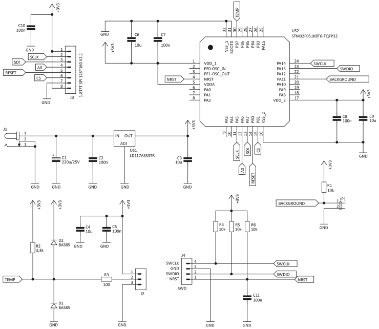 Schemat ideowy termometru pokazano na rysunku 1. Za akwizycję danych z czujnika oraz obsługę wyświetlacza jest odpowiedzialny 32-bitowy mikrokontroler typu STM32F051 wyposażony w 16 kB pamięci RAM, co – jak się okaże – wcale nie jest na wyrost. Oprócz tego rdzeń może być taktowany z częstotliwością 48 MHz, a szybkość też ma tutaj duże znaczenie, ponieważ pozwala w bardzo krótkim czasie odświeżyć zawartość ekranu.