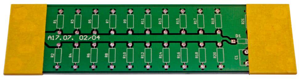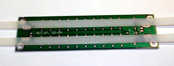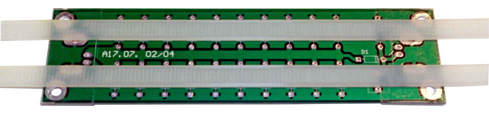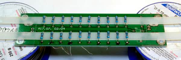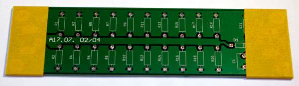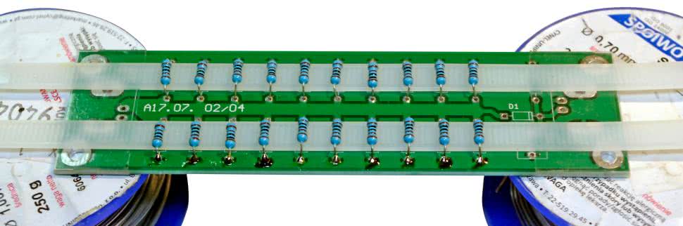 Po solidnym zalutowaniu rezystorów R1...R20 (najlepiej po obu stronach PCB) opaski samozaciskowe należy delikatnie odkleić od PCB i wysunąć spod rezystorów, a następnie usunąć odcinki taśmy samoprzylepnej dwustronnej oraz zmyć (np. denaturatem) resztki pozostałego po niej kleju.