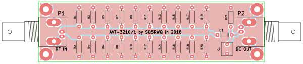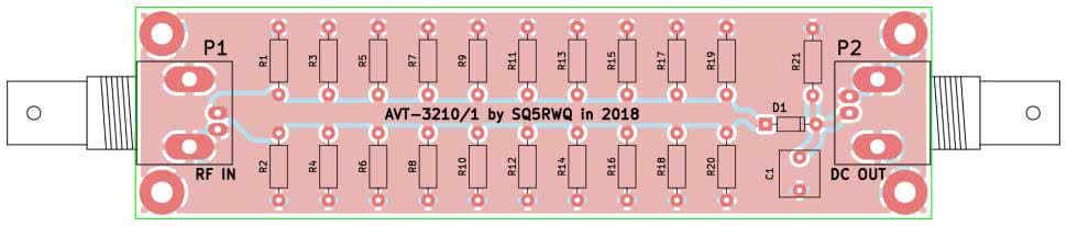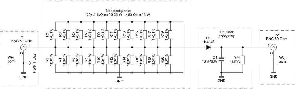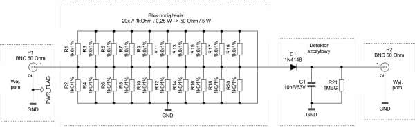 Wejściowy sygnał mocy jest wprowadzany na zestaw 20 sztuk połączonych równolegle rezystorów R1...R20 o opornościach równych 1 kΩ, tolerancji 1% i nominalnych mocach strat termicznych równych 0,25 W. Zastosowanie popularnych rezystorów o tolerancji 5% mogłoby pogorszyć nieco własności impedancyjne (a więc i dopasowanie do źródła energii przyrządu), bowiem rozrzuty wartości elementów, pochodzących z tej samej serii produkcyjnej, mogłyby okazać się podobne i – w rezultacie – nie skompensować się w ramach oczekiwanej wypadkowej impedancji 50 Ω.