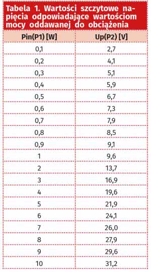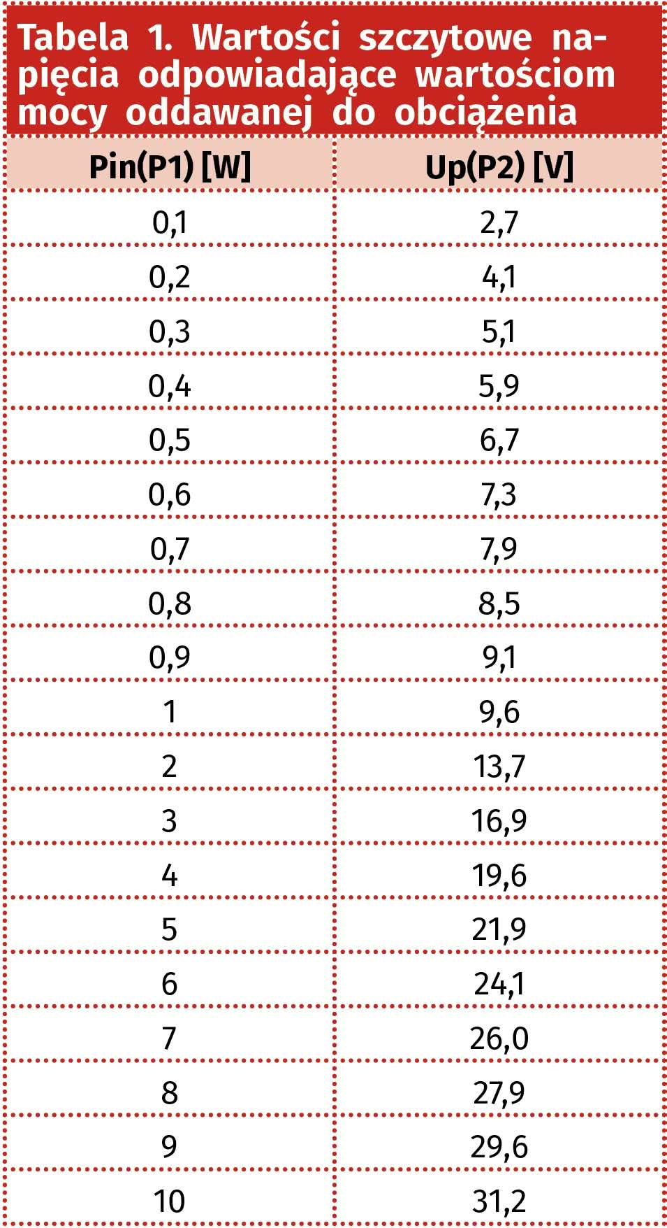 W egzemplarzu modelowym sprawdzono bezpieczne rozpraszanie mocy o wartości 10 W nawet przez kilka minut, jednak może to zależeć od sposobu oraz staranności wykonania obudowy przyrządu i zasadniczo obciążanie przyrządu mocami znacznie przekraczającymi 5 W przez dłuższy okres nie jest zalecane. Wartość mocy oddawanej do obciążenia możemy odczytać z tabeli 1 lub z wykresu na rysunku 6, które odwzorowują zależność na wartość szczytową Up [V] napięcia sinusoidalnego przy mocy chwilowej Pin [W], podanej na port P1 obciążenia Rload=50 Ω, pomniejszoną o uśredniony spadek napięcia na diodzie detekcyjnej D1, obciążonej rezystorem R21 i pojemnością C1: