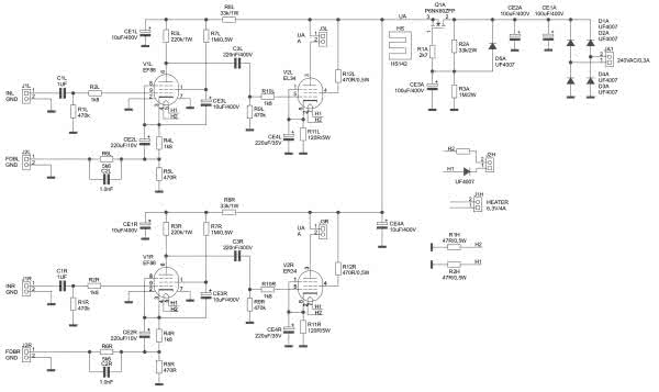 Schemat ideowy wzmacniacza pokazuje rysunek 2. Elementy kanału lewego mają oznaczenia zakończone literą L, kanału prawego literą R, zaś elementy zasilacza anodowego wyróżnione są literką A, a obwód żarzenia literką H. Sygnał wejściowy ze złącza J1L/R, po separacji składowej stałej w C1L podany jest na siatkę pentody V1L.