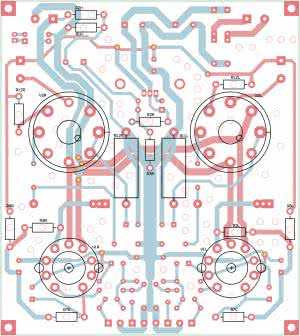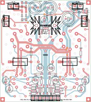 Wzmacniacz wykonany jest na dwustronnym obwodzie drukowanym, zawierającym wszystkie elementy elektroniczne z wyjątkiem transformatorów. Rozmieszczenie elementów pokazują rysunki 3 i 4. Lampy zamontowane są na podstawkach, od strony podstawek nie umieszczono żadnych wysokich elementów, możliwe jest więc wyeksponowanie „żarzących” się lamp na obudowie wzmacniacza. Warto jednak pamiętać o zabezpieczeniu przed dotknięciem np. przy pomocy siatki ochronnej.