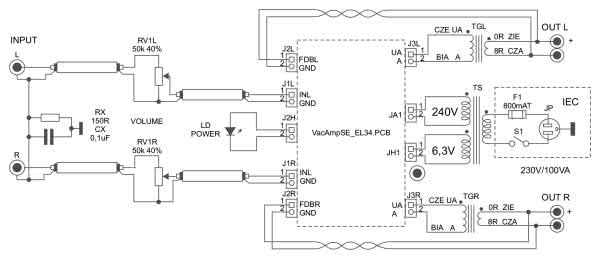 - V2L, V2R: EL34 + podstawka