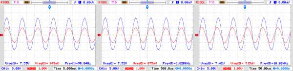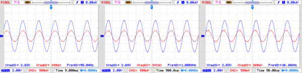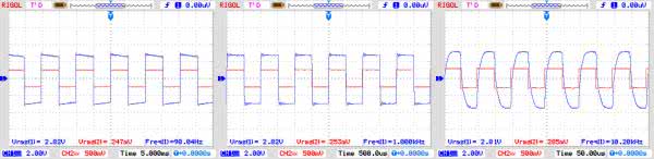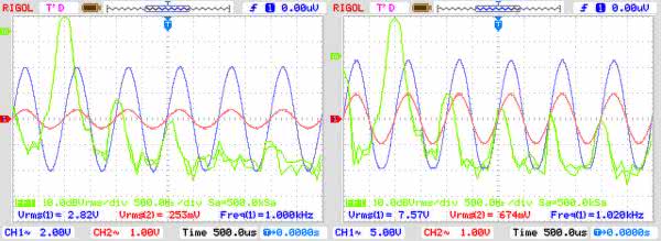Jeżeli wzmacniacz został uruchomiony statycznie to nadszedł czas na bardziej szczegółowe pomiary. Po zwiększeniu wysterowania, warto sprawdzić przebiegi wyjściowe dla sterowania przebiegiem sinusoidalnym przy mocy 1 W/7 W dla kilku częstotliwości np. 100 Hz/1 kHz/10 kHz. Dla mniejszej mocy warto ocenić przenoszenie przebiegu prostokątnego, na jego podstawie należy skorygować wartości R6L/R, C2L/R, aby otrzymać prawidłowe odtworzenie przebiegu niezależnie od zastosowanego transformatora wyjściowego. Przebiegi otrzymane podczas pomiarów modelu pokazują rysunki 7a, 7b, 7c, 7d.