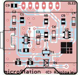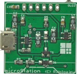 Niewielki, dwustronny obwód drukowany z przewagą elementów SMD wymiarami zbliżony jest do wymiarów płytki drukowanej zastosowanego modułu wyświetlacza OLED (28×28 mm). Montaż urządzenia rozpoczynamy od warstwy BOTTOM, gdzie przylutowujemy układ BME280. Proces ten najłatwiej wykonać przy użyciu stacji lutowniczej na gorące powietrze (tzw. Hot Air) i odpowiednich stopów lutowniczych, gdyż obudowa tego elementu nie pozwala na zastosowanie typowej stacji lutowniczej. Następnie lutujemy pozostałe elementy półprzewodnikowe, potem rezystory i kondensatory, dławik i na samym końcu wyłącznik PWR. Na warstwie TOP dokonujemy montażu w tej samej kolejności kończąc przylutowaniem gniazda USB. Z uwagi na zagęszczenie wyprowadzeń układów scalonych przed pierwszym podłączeniem urządzenia do zasilania należy jeszcze raz sprawdzić jakość wykonanych połączeń, aby nie dopuścić do ewentualnych zwarć. Wspomniana kontrola będzie znacznie łatwiejsza, jeśli zmontowaną płytkę przemyjemy alkoholem izopropylowym w celu wypłukania nadmiaru topnika. Na samym końcu, do tak przygotowanej płytki, montujemy wyświetlacz OLED, zwyczajnie lutując jego wyprowadzenia w przeznaczone do tego celu pola lutownicze. Połączenia te zapewniają jednocześnie wystarczający montaż mechaniczny. Wybierając konkretny moduł wyświetlacza dostępny w handlu należy zakupić wersję wyposażoną w następujące sygnały sterujące: CLK (sygnał zegarowy magistrali SPI), MOSI (wejście danych magistrali SPI), CS (wejście wyboru sterownika SSD1306) oraz DC (wejście, decydujące o charakterze wysyłanych danych: 1→ dane pamięci obrazu, 0→ rozkaz sterujący). Nie mniej ważne jest rozmieszczenie sygnałów zasilających, jako że moduły dostępne w handlu mają często zamienione miejscami sygnały zasilania (VCC) i masy (GND). Akumulator zasilający podłączamy do wyprowadzeń +/- po stronie TOP i umieszczamy pomiędzy modułem wyświetlacza OLED a płytką naszego urządzenia. Poprawnie zmontowany układ powinien działać od razu po podłączeniu zasilania. Widok zmontowanego urządzenia microStation (od strony TOP) bez wlutowanego wyświetlacza OLED prezentuje fotografia 5, a od strony bottom fotografia 6.