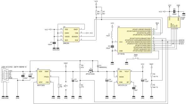 Schemat ideowy urządzenia nazwanego, z uwagi na miniaturowe wymiary, microStation, pokazano na rysunku 1. Jest to bardzo prosty system mikroprocesorowy, którego „sercem” jest niewielki mikrokontroler firmy Microchip (dawniej Atmel) typu ATtiny84 realizujący całą, założoną funkcjonalność urządzenia. Mikrokontroler ten steruje pracą niewielkiego graficznego wyświetlacza OLED o organizacji 128×64 pikseli, używając do tego celu programowej implementacji interfejsu SPI, w który wyposażony jest zastosowany wyświetlacz. Obsługuje także scalony czujnik temperatury, wilgotności i ciśnienia atmosferycznego pod postacią układu firmy Bosch Sensortec o oznaczeniu BME280, używając do tego celu programowej implementacji interfejsu I2C, w który wyposażony jest wspomniany czujnik.