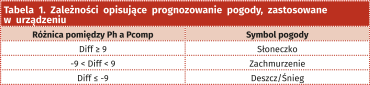 W nieskomplikowanych konstrukcjach stacji pogodowych, które do prognozowania pogody wykorzystują wyłącznie wartość mierzonego ciśnienia atmosferycznego, korzysta się z dwóch rodzajów algorytmów. Pierwszy z nich śledzi zmiany ciśnienia atmosferycznego i po upływie pewnego czasu (zwykle 6 do 12 godzin) na podstawie gradientu zmian jest w stanie określić oczekiwany stan pogody. Drugi z algorytmów, z którego korzysta nasze urządzenie, oblicza wzorcowe ciśnienie dla danej wysokości n.p.m. (na której to się znajdujemy) dla dobrych warunków pogodowych (wspomniany wcześniej wzór na Ph) i na podstawie różnicy ciśnienia mierzonego i wzorcowego określa prognozę pogody niwelując potrzebę oczekiwania na zmiany gradientu ciśnienia. Oczywiście, prognozy takie mogą być obarczone dużym błędem, lecz wykonanie bardziej wiarygodnej prognozy pogody wymagałoby dysponowania większa liczbą wielkości wejściowych. Dla naszego urządzenia przyjęto zależności pokazane w tabeli 1.