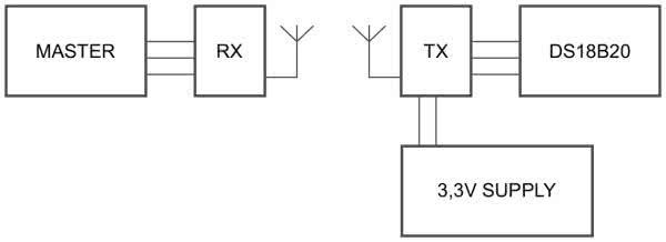 Podłączony jest w miejsce układu DS18B20 w urządzeniu nadrzędnym. Układ nadrzędny może w każdej chwili, przy użyciu zapytania zgodnego z protokołem 1-wire, zażądać informacji, a wtedy odbiornik przekaże dane, które otrzymał z nadajnika. Schemat blokowy takiego systemu pokazuje rysunek 1.