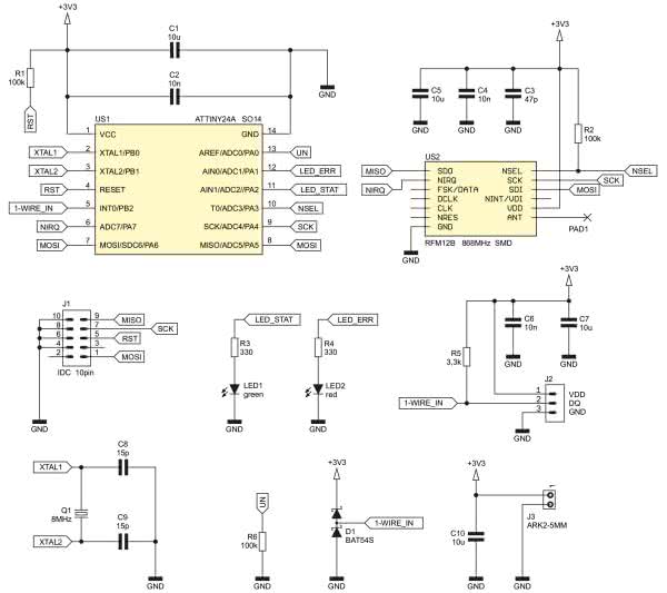 System przedłużający magistralę 1-wire drogą radiową składa się z dwóch modułów - nadawczego i odbiorczego - o identycznej budowie od strony elektrycznej. Różnica tkwi w oprogramowaniu. Schemat ideowy pojedynczego modułu znajduje się na rysunku 2. Układem zarządzającym pracą całego modułu, w tym komunikacją radiową, jest mikrokontroler Attiny24A. Jego zasilanie odsprzęgają dwa kondensatory, C1 i C2, umiejscowione blisko odpowiednich wyprowadzeń. Dodatkowy rezystor R1 podciąga wyprowadzenie RESET do napięcia +3,3 V, którym zasilany jest cały moduł.