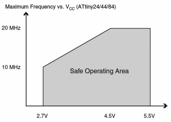 Magistrala 1-wire jest restrykcyjna pod względem zależności czasowych. Dlatego zdecydowano się na stabilizację zegara mikrokontrolera przy użyciu zewnętrznego rezonatora kwarcowego o częstotliwości 8 MHz. Taka, a nie wyższa, wartość częstotliwości została wymuszona relatywnie niskim napięciem zasilania - w tych warunkach, częstotliwość sygnału zegarowego nie może być większa niż ok. 10 MHz, na co wskazuje wykres z rysunku 3.