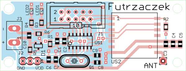 Oba moduły, nadajnik i odbiornik, realizowane są na tej samej płytce drukowanej o wymiarach 25×65 mm. Schemat płytki PCB wraz z rozmieszczeniem elementów pokazuje rysunek 4. Obsada elementów dla obu modułów jest identyczna, z ewentualną różnicą w postaci wspomnianego wcześniej rezystora R5. Po przylutowaniu elementów w obudowach do montażu powierzchniowego (SMD), na płytce powinien znaleźć się kwarc XTAL1 oraz wszystkie złącza. Na samym końcu polecam przylutować moduł RFM12B, aby nie uległ uszkodzeniu podczas montażu pozostałych części.