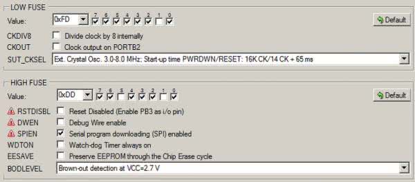 Po podłączeniu zasilania o napięciu 3,3 V (dobrze filtrowane i stabilizowane), mikrokontrolery w obu modułach należy zaprogramować wsadem pamięci Flash. Ponadto, należy zmienić ustawienia fusebitów na wartości: