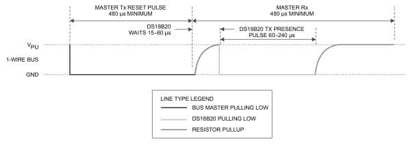 Najpierw układ nadrzędny wymusza stan niski na linii, zaś potem czynią to układy podrzędne, po odczekaniu pewnego czasu. Taka „odpowiedź” jest dla układu nadrzędnego znakiem, że ma podłączonych działających „rozmówców”. Zatem należy sprawdzić stan linii 1-wire po min. 60 μs (powinien być niski), a potem jeszcze raz, po min. 240 μs - wtedy stan logiczny powinien wrócić do wysokiego. Cała procedura musi trwać min. 960 μs.