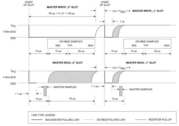 Wysyłka bitów przez urządzenie podrzędne (poprzedzona odpowiednią komendą) polega na tym, że urządzenie nadrzędne wystawia zbocza opadające. Jeżeli układ podrzędny ma wysłać „1”, wówczas nie robi nic i po ok. 10...13 μs od rozpoczęcia impulsu, stan logiczny linii zdąży powrócić do stanu wysokiego, co rejestruje układ nadrzędny. Jeżeli zaś ma zostać wysłane „0”, układ podrzędny „przeciąga” uchwycone zbocze opadające do 15 μs, po czym zwalnia linię. Układ nadrzędny, który w tym czasie sprawdza stan linii, odczyta „0”. Co istotne, to układ nadrzędny decyduje o tym, ile bitów odczyta. Cały scratchpad składa się z 9 bajtów (tabela 3), lecz nic nie stoi na przeszkodzie, by odczytać tylko pierwsze dwa - tyle wystarczy do odczytu temperatury. Użyteczny może być również ostatni bajt - zawiera sumę kontrolną (CRC), dzięki której można dowiedzieć się, czy otrzymana informacja jest poprawna.