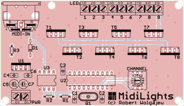 Prezentowany układ pozwala na sterowanie ośmioma kanałami LED za pomocą dowolnego sterownika MIDI (komputer z odpowiednim oprogramowaniem, klawiatura MIDI lub sprzętowy sekwenser MIDI), przy czym w każdym kanale LED możliwa jest niezależna regulacja jasności świecenia w 128 krokach regulacji. Schemat urządzenia MidiLights pokazano na rysunku rysunku 1.