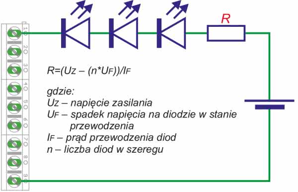 gdzie I to prąd przewodzenia diod LED, zaś RDS(ON) to rezystancja dren-źródło tranzystora w stanie załączenia równa około 0,1 Ω.