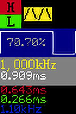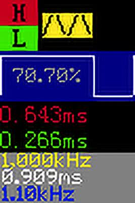 Gdy komunikacja z komputerem działa poprawnie, sonda jest skonfigurowana, można przystąpić do testu. W tym celu, na wejście sondy należy doprowadzić sygnał z generatora o częstotliwości 1 kHz i amplitudzie w zakresie 0...Vcc sondy. Na ekranie powinien pokazać się wynik pomiaru (rysunek 11). Na samej górze wyświetlane są symbole „H” i „L” oraz symbol fali. Informuje to o wykryciu fali prostokątne o częstotliwości co najmniej kilkudziesięciu Hz. Poniżej graficznie i cyfrowo na niebieskim tle wypełnienie przebiegu. Następnie na żółto częstotliwość sygnału, jego okres, na biało na szarym tle. Na samym dole, na czarnym tle, na zielono czas trwania poziomu wysokiego, na czerwono niskiego. W niebieskim kolorze wyświetlana jest częstotliwość wyliczona z pomiaru okresu sygnału. Można sprawdzić inne częstotliwości i wypełnienie impulsów. Przycisk MODE zmienia wygląd ekranu (rysunek 12), następne naciśnięcie przycisku włączy oscyloskop (rysunek 13).