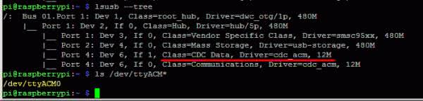 W systemie Linux komenda lsusb –tree wyświetli drzewo urządzeń USB a ls /dev/ttyACM* pokaże wszystkie urządzenia CDC (rysunek 6).