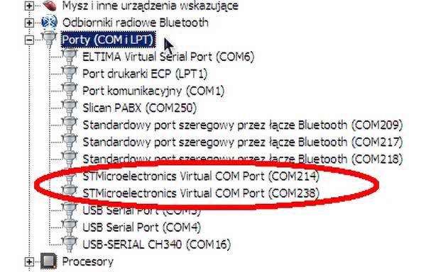 Następnie należy odnaleźć port o nazwie: „STMicroelektronics” (rysunek 4). Gdy odnaleziono więcej niż jeden port można próbować odłączyć sondę i zobaczyć który port zniknął, można też w terminalu wybierać numery COM przypisane do STMicroelektronics wydać komendę ati lub @n aby wyświetlić nazwę urządzenia.