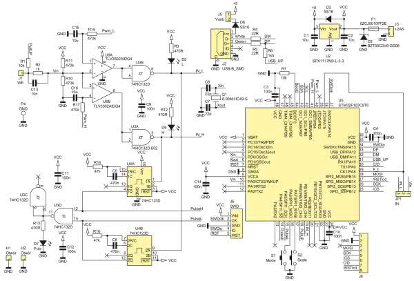 Schemat sondy pokazuje rysunek 1. Gdy sonda ma być zasilana z uruchamianego systemu, napięcie zasilające należy doprowadzić do J3. D3 i F1 chronią układy przed skutkami zbyt wysokiego napięcia zasilającego lub odwrotnej jego polaryzacji. W przypadku zasilania z USB lub zewnętrznego zasilacza (katoda D9) napięcie jest stabilizowane przez U2. Sercem sondy jest mikrokontroler ARM STM32F103 pracujący z częstotliwością 72 MHz. Wysokie taktowanie pozwala na pomiar częstotliwości sygnałów do 36 MHz oraz czasu z rozdzielczością 27 ns.