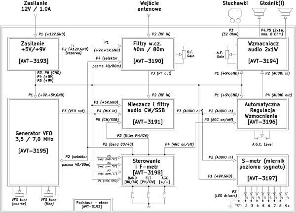 Na rysunku 1 zaprezentowano schemat blokowo-montażowy odbiornika „Dosia”, uzupełniony o mikroprocesorowy moduł kontrolno-sterujący (AVT3198) wraz z dedykowanymi połączeniami z pozostałymi modułami całego projektu.