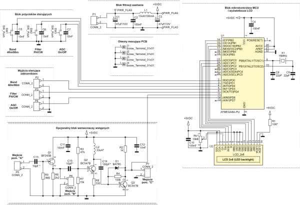Na rysunku 2 pokazano schemat elektryczny omawianego modułu z wydzielonymi poszczególnymi blokami funkcjonalnymi. Zasilanie stabilizowane +5 V DC jest podawane na port P1, za którym umieszczono czwórnik filtrujący z elementami C1, C2, L1 i C3, pracujący w topologii tzw. PI-filtru. Jego zadaniem jest dwukierunkowa separacja źródła głównego napięcia zasilającego +5 V od potencjalnych zakłóceń impulsowych, pochodzących od mikrokontrolera (U1) oraz wyświetlacza LCD (U2). Zakłócenia mogłyby przenikać do obwodów modułów: filtrów wejściowych w.cz., mieszacza i amplifiltrów oraz generatora VFO i być wyraźnie słyszalne podczas pracy odbiornika.