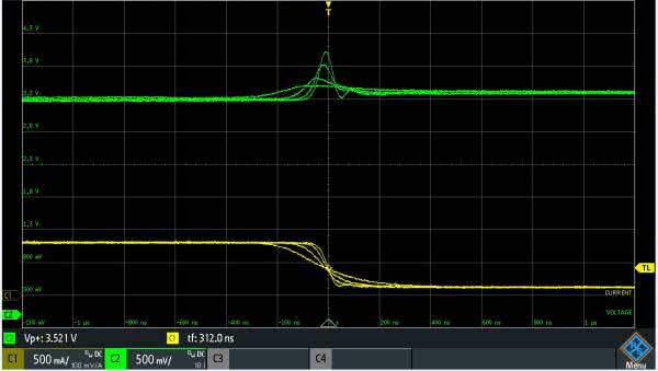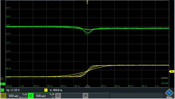 Widać, że w momencie wzrostu obciążenia napięcie na wyjściu LM2596 spada do wartości ok. 2,8 V. Natomiast po ustąpieniu wzmożonego poboru prądu, szpilka napięciowa sięga aż 4,1 V. Na rysunku 6 pokazano moment wzrostu obciążenia dla różnych stromości impulsu prądowego (czym większa, tym gorsze są parametry odpowiedzi modułu LM2596). Rysunek 7 pokazuje analogiczną sytuację, tym razem dla momentu skokowego zmniejszenia obciążenia.