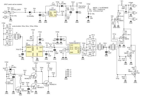 W dolnej części schematu widoczny jest przycisk SW2 oraz obwód filtrujący drganie styków. Tranzystory bipolarne Q5...Q8 tworzą prostą logikę zamieniającą dowolnie długie przyciśnięcie przycisku na krótki impuls. Naciśnięcie przycisku aktywuje układ czasowy zbudowany na bazie NE555, który poprzez driver TC4427 otwiera jeden z tranzystorów MOS na wyjściach układu (prawa część schematu).