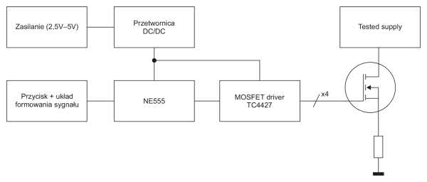 Schemat blokowy zaprezentowano na rysunku 2. Głównym komponentem jest nieśmiertelny timer NE555. Po naciśnięciu przez użytkownika przycisku, generuje impuls o odpowiedniej długości. Tranzystor unipolarny wraz z szeregowo włączonym rezystorem stanowi obciążenie dla badanego układu zasilającego. Układ TC4427 odpowiada za szybkie przeładowywanie bramki tranzystora MOSFET, dzięki czemu generowane impulsy poboru prądu cechują się stromymi zboczami narastającymi oraz opadającymi.