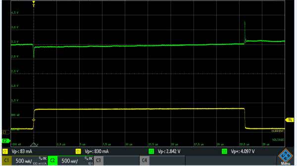 Wciśnięcie przycisku SW2 powodowało skok prądu z poziomu 100 mA do poziomu 800 mA. Na wszystkich oscylogramach kolor żółty przedstawia przebieg prądu pobieranego z testowanej przetwornicy LM2596, natomiast kolor zielony przebieg napięcia na jej wyjściu. Rysunek 5 pokazuje oscylogram całego impulsu o długości 20 μs.