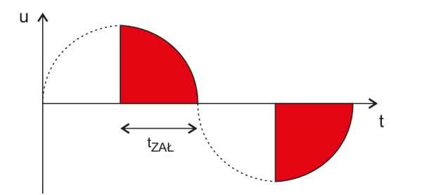 Regulacja mocy urządzeń zasilanych napięciem sinusoidalnie zmiennym o niskiej wartości skutecznej nie należy do zadań trywialnych. Najprostszym podejściem do rozwiązania tego problemu jest sterowanie fazowe, którego idea sprowadza się do opóźnienia załączenia obciążenia po odpowiednim czasie od przejścia napięcia przez zero. Im większy czas tego opóźnienia, tym mniejsza będzie moc wydzielona, ponieważ całka z pozostałej części sinusoidy będzie miała mniejszą wartość. Intuicyjnie rzecz ujmując, chodzi o zasilanie sterowanego układu wykonawczego „kawałkami” sinusoidy: im mniejszy kawałek (krótszy czas załączenia tZAŁ), tym mniejsza będzie moc – co obrazuje rysunek 1.