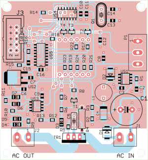 Układ został zmontowany na dwustronnej płytce drukowanej o wymiarach 65×70 mm, której wzór ścieżek oraz schemat montażowy pokazuje rysunek 3. W odległości 3 mm od krawędzi płytki znalazły się otwory montażowe.