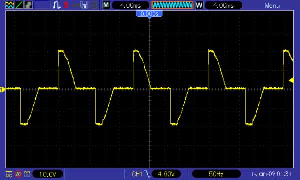 Układ prototypowy został przetestowany przy zasilaniu napięciem o wartości ok. 12 V wartości skutecznej i pod obciążeniem rezystancyjnym. Przy użyciu oscyloskopu zostały wykreślone (przy tej samej podstawie czasu i czułości toru Y) przebiegi napięcia na zaciskach obciążenia przy ustawieniu 50% (rysunek 5) i 99,9% (rysunek 6) czasu trwania triaka w stanie przewodzenia.