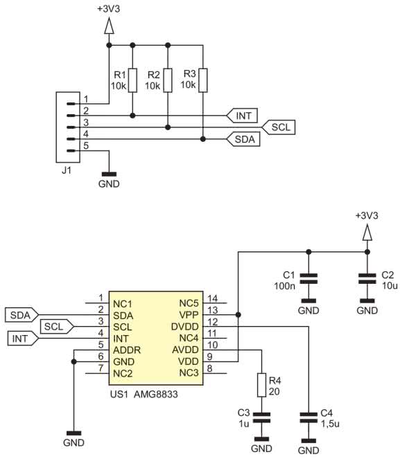 Płytkę zawierającą czujnik AMG8833 podłącza się do wyprowadzeń złącza J4. Jak wspomniano wcześniej, komunikacja z nim odbywa się poprzez interfejs I2C, więc po stronie mikrokontrolera użyto dedykowanego do tego peryferium. Rezystory podciągające dublują się z tymi, które można znaleźć przy czujniku, lecz nie stanowi to problemu: przyspieszają przeładowywanie pojemności połączeń oraz również odprowadzają ładunki elektrostatyczne po odłączeniu przewodów połączeniowych. Zamiast dedykowanej płytki z czujnikiem, której schemat przedstawiono wyżej, można zastosować gotowy moduł typu TPA64 lub pokrewny. Układ wyprowadzeń modułu TPA64 jest taki sam, jak w złączu J4.