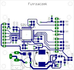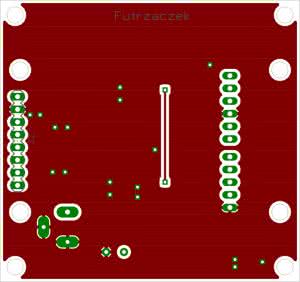 Układ kamery termowizyjnej został zmontowany na dwóch płytkach drukowanych. Większa, zawierająca wyświetlacz, ma wymiary 60×56,5 mm, a jej schemat ścieżek oraz schemat montażowy pokazują rysunki 5 i 6.