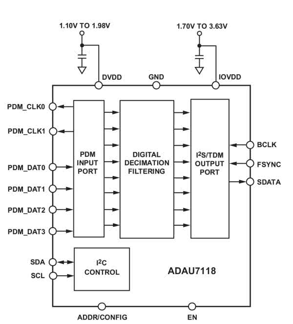 Układ posiada dwa kanały generatora zegarowego, które mogą zostać niezależnie wyłączone w celu obniżenia poboru mocy, gdy nie wszystkie mikrofony są dołączone, np. w trybie TDM4, I2S. Interfejs wejściowy PDM posiada cztery dwukanałowe porty PDDT0...3 (PDMDAT0...3), do podłączenia maksymalnie ośmiu mikrofonów. Układ ADAU7118 umożliwia elastyczną konfigurację przyporządkowania slotów TDM do kanałów PDM.