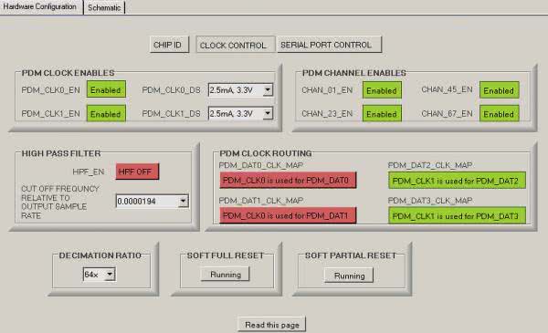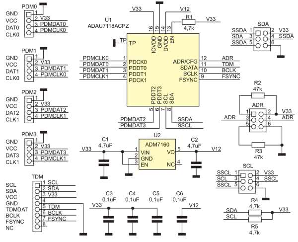 Układ U1 (ADAU7118) odpowiada za translację sygnałów cyfrowych z mikrofonów PDM na standard TDM. Pracuje na magistrali szeregowej audio jako urządzenie slave, wymaga więc dostarczenia zegarów FSYNC oraz BLCK (złącze TDM) z portu szeregowego DSP lub SoC. ADAU7118 wymaga spełnienia minimalnej zależności: BCLK=<64 FCLK, ale obsługuje też krotności 128, 192, 256, 384, 512. Z sygnałów tych generowany jest przebieg zegarowy PDMCK (PCM_CLKx)=64 FSYNC taktujący mikrofony, krotność PDM CLK można zmienić podczas konfiguracji układu, aby zapewnić częstotliwość zegara transmisji PDM w zakresie dopuszczanym przez mikrofon.