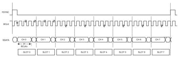 ADAU7118 obsługuje też dwukanałową konwersję PDM/I2S, ale użycie jej jest nieekonomiczne, gdyż prościej jest to zrealizować na układzie ADAU7002 opisanym w kursie AudioDSP cz. 6. Sprzętowy tryb TDM8 pozwala na najprostsze połączenie konwertera z DSP, przebiegi magistrali szeregowej w trybie TDM8 pokazano na rysunku 3.