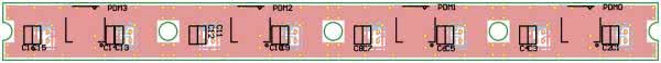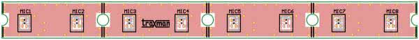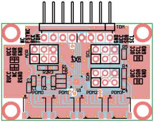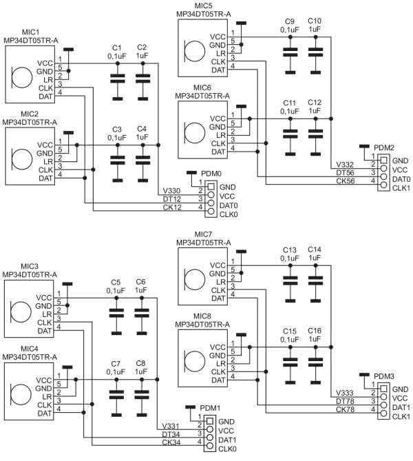Z płytką konwertera PDM/TDM, współpracuje moduł mikrofonów PDM, którego schemat pokazano na rysunku 4. Zawiera osiem mikrofonów MP34DT05. Pracują one parami 1/2, 3/4, 5/6, 7/8. Mikrofony MIC1...4 taktowane są zegarem PDCK0, MIC5...8 zegarem PDCK1. Płytka dopuszcza mechaniczne rozdzielenie par mikrofonów w celu montażu uwzględniającego wymogi aplikacji np. detekcja źródła dźwięku. Mikrofony połączone są z płytką konwertera możliwie krótkimi przewodami, złączami JST 1,00 mm. Przy dłuższych połączeniach konieczne jest zastosowanie przewodów w ekranie (częstotliwość zegarów do 3 MHz).