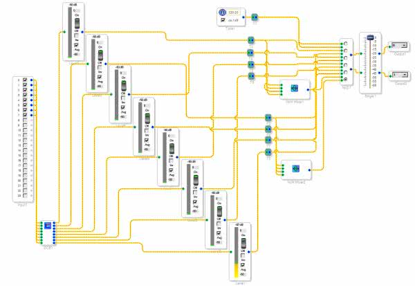 Aby przetestować moduł w praktyce, użyłem płytkę STK_ADAU1442 – Mega DSP opisaną w EP3/14 oraz moduł wyjść analogowych z EP10/14. Interfejs cyfrowy audio modułu podłączony jest do pierwszego portu szeregowego w gnieździe SDI02 (sygnały SDATAIN0 – TDM, LRCK0 – FSYNC, BCLK0 – BCK, V33D – VCC, GND – GND), interfejs I2C podłączony jest do gniazda programatora I2C, użyty kwarc XT=12,288 MHz (fs=48 kHz), zwory w położeniu domyślnym 256 fs. Do testów przygotowano projekt PDM8_Test1442, którego schemat pokazano na rysunku 7. Projekt dostępny jest w materiałach dodatkowych.